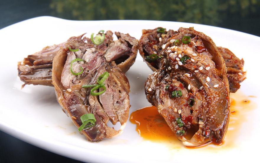 麻辣兔头”是四川人比较喜欢的一种休闲小吃,现在已经慢慢走出四川,在其他省市开始流行。“麻辣兔头”的制作方法相当讲究,从加工到卤制、炸炒,每一道工序都要求严格,特别讲究调味料的选用,麻辣兔头是四川成都特色名小吃之一,鲜香味美,口感极佳,制作原料主要有速冻鲜兔头、干辣椒、姜块、精炼油等。吃兔头很讲章法,如同上海人吃醉虾,虾肉吃掉,虾壳还不破。啃兔头,需要充分调动口、唇、舌的各种功能,才能品出兔头滋味的妙处来。吃的是麻辣口味,红油汪汪,上面能看见芝麻和花椒末,已经卤得熟透,骨脱肉滑。