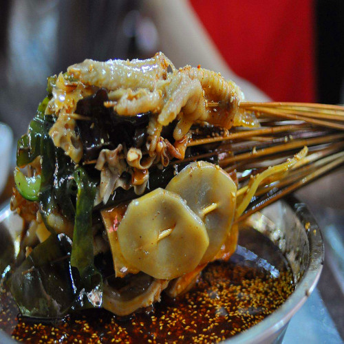 钵钵鸡有着深沉的历史渊源。钵钵鸡食用便利,多种口味可选择,配以特征鸡汤饭即可休闲品味,亦可权作一餐。钵钵鸡,还是能够欣赏的。将肉煮熟,不能煮烂,八分火候就行。此后晒干,切成片,用竹签分门别类串成串。肉片是肉片,脏腑是脏腑,鸡腿是鸡腿,翅膀是翅膀。放进藤椒油汤里一捞,再举至嘴边,油艳欲滴。盛装鸡肉的钵钵也是能够欣赏的。青花钵,为上。粉红的肉,青绿的汤,翠蓝的钵。把樟树、桂树木板镶拢来,外面用竹篾窟紧,就像一只洗脚盆。