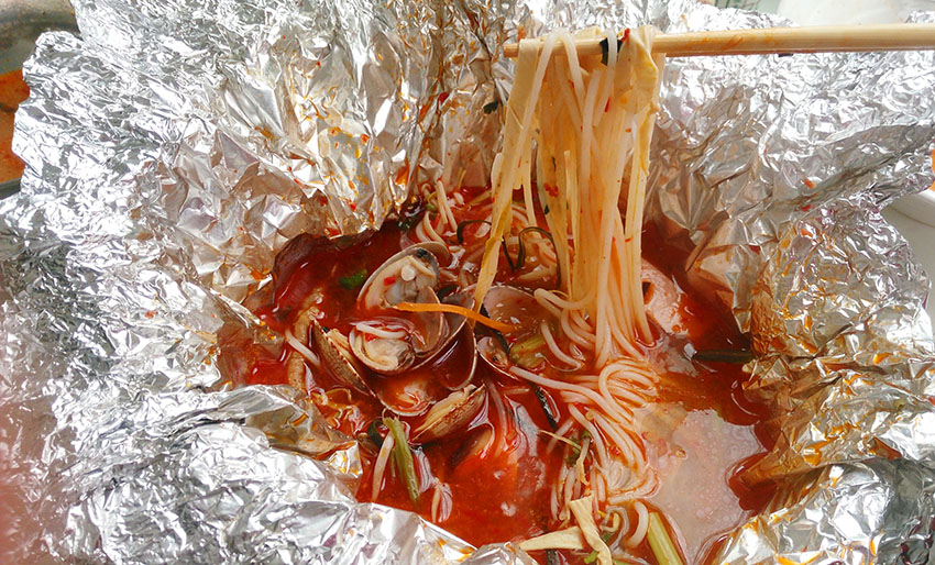 第四步,主要系统如何用锡纸烤制花甲。这里重点掌握花甲的烤制时间、火候、放佐料、放粉丝等知识。
